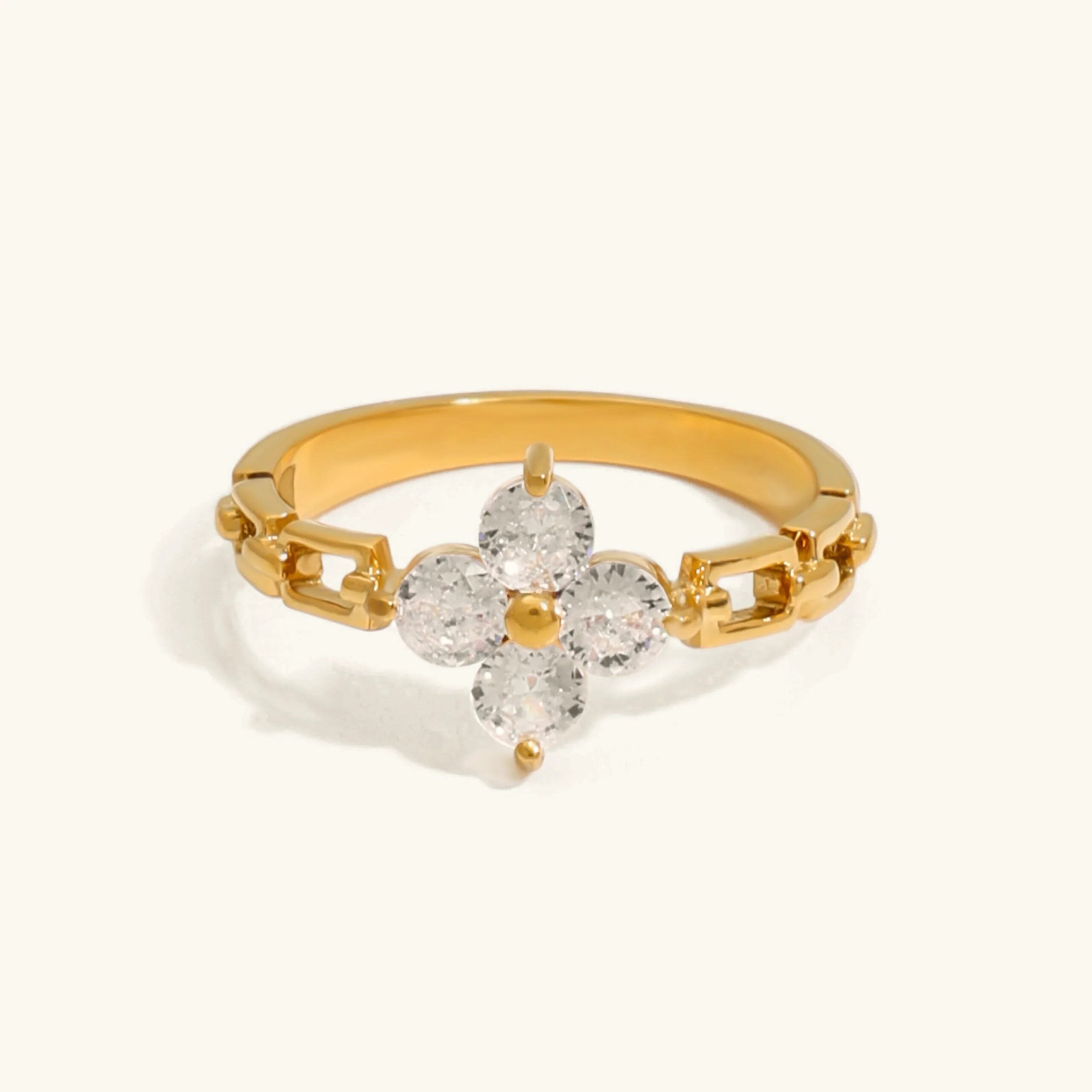 O anel Canducha Clestine floresce com brilho floral. Seu delicado desenho de pétalas, adornado com brilhantes zircônias cúbicas, cria um motivo floral cativante. Esta peça impermeável e hipoalergénica acrescenta um toque de elegância feminina a qualquer combinação de vestuário à sua escolha.